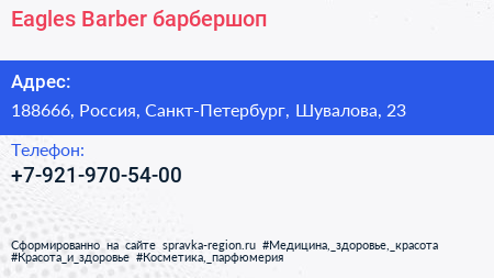Eagles Barber, барбершоп по адресу 188666, Россия, Санкт-Петербург, Шувалова, 23 в дальнейшем Организация, размещена в следующих категориях: