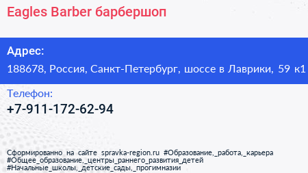 Eagles Barber, барбершоп по адресу 188678, Россия, Санкт-Петербург, шоссе в Лаврики, 59 к1 в дальнейшем Организация, размещена в следующих категориях: