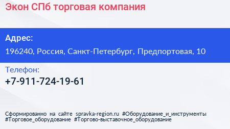 Экон-СПб, торговая компания по адресу 196240, Россия, Санкт-Петербург, Предпортовая, 10 в дальнейшем Организация, размещена в следующих категориях: