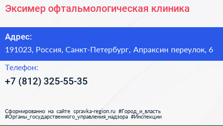Эксимер, офтальмологическая клиника по адресу 191023, Россия, Санкт-Петербург, Апраксин переулок, 6 в дальнейшем Организация, размещена в следующих категориях: