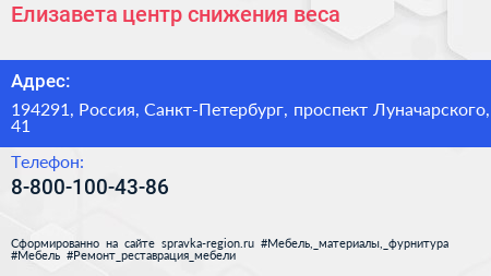 Елизавета, центр снижения веса по адресу 194291, Россия, Санкт-Петербург, проспект Луначарского, 41 в дальнейшем Организация, размещена в следующих категориях: