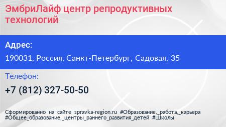 ЭмбриЛайф, центр репродуктивных технологий по адресу 190031, Россия, Санкт-Петербург, Садовая, 35 в дальнейшем Организация, размещена в следующих категориях:
