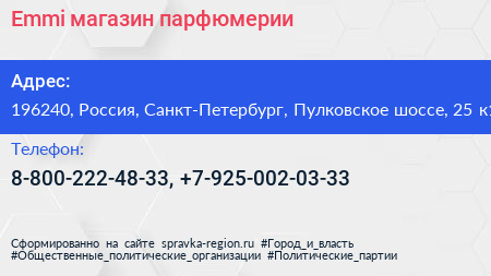 Emmi, магазин парфюмерии по адресу 196240, Россия, Санкт-Петербург, Пулковское шоссе, 25 к1 в дальнейшем Организация, размещена в следующих категориях: