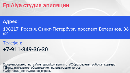 EpiAlya, студия эпиляции по адресу 198217, Россия, Санкт-Петербург, проспект Ветеранов, 36 к2 в дальнейшем Организация, размещена в следующих категориях: