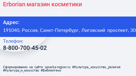 Erborian, магазин косметики по адресу 191040, Россия, Санкт-Петербург, Лиговский проспект, 30 в дальнейшем Организация, размещена в следующих категориях: