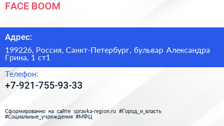FACE BOOM по адресу 199226, Россия, Санкт-Петербург, бульвар Александра Грина, 1 ст1 в дальнейшем Организация, размещена в следующих категориях: