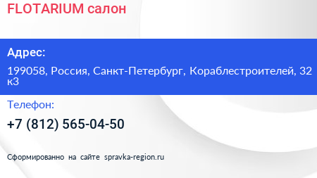 FLOTARIUM, салон по адресу 199058, Россия, Санкт-Петербург, Кораблестроителей, 32 к3 в дальнейшем Организация, размещена в следующих категориях: