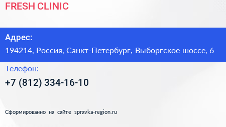 FRESH CLINIC по адресу 194214, Россия, Санкт-Петербург, Выборгское шоссе, 6 в дальнейшем Организация, размещена в следующих категориях: