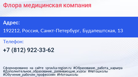 Флора, медицинская компания по адресу 192212, Россия, Санкт-Петербург, Будапештская, 13 в дальнейшем Организация, размещена в следующих категориях: