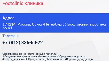 Footclinic, клиника по адресу 194214, Россия, Санкт-Петербург, Ярославский проспект, 66 к1 в дальнейшем Организация, размещена в следующих категориях: