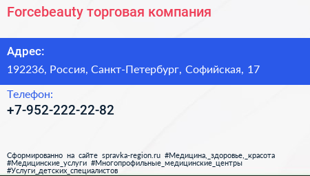 Forcebeauty, торговая компания по адресу 192236, Россия, Санкт-Петербург, Софийская, 17 в дальнейшем Организация, размещена в следующих категориях:
