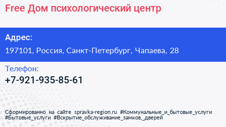Free Дом, психологический центр по адресу 197101, Россия, Санкт-Петербург, Чапаева, 28 в дальнейшем Организация, размещена в следующих категориях: