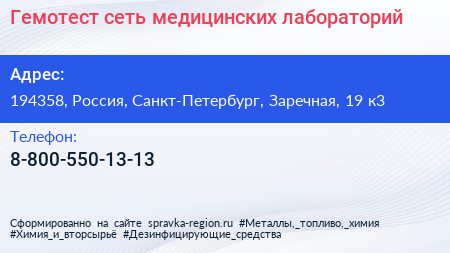 Гемотест, сеть медицинских лабораторий по адресу 194358, Россия, Санкт-Петербург, Заречная, 19 к3 в дальнейшем Организация, размещена в следующих категориях: