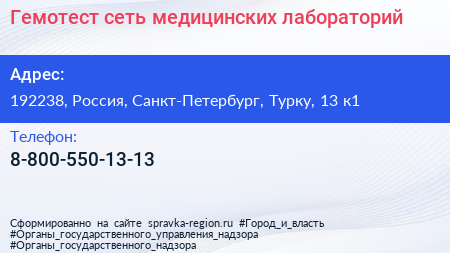 Гемотест, сеть медицинских лабораторий по адресу 192238, Россия, Санкт-Петербург, Турку, 13 к1 в дальнейшем Организация, размещена в следующих категориях: