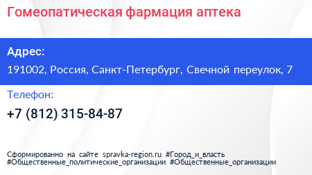 Гомеопатическая фармация, аптека по адресу 191002, Россия, Санкт-Петербург, Свечной переулок, 7 в дальнейшем Организация, размещена в следующих категориях:
