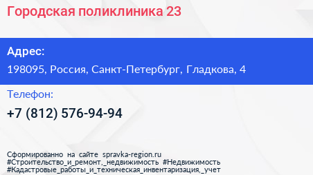 Городская поликлиника №23 по адресу 198095, Россия, Санкт-Петербург, Гладкова, 4 в дальнейшем Организация, размещена в следующих категориях: