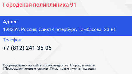 Городская поликлиника №91 по адресу 198259, Россия, Санкт-Петербург, Тамбасова, 23 к1 в дальнейшем Организация, размещена в следующих категориях: