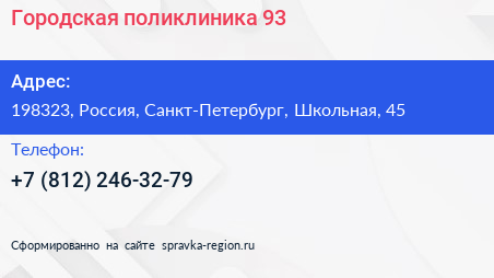 Городская поликлиника №93 по адресу 198323, Россия, Санкт-Петербург, Школьная, 45 в дальнейшем Организация, размещена в следующих категориях: