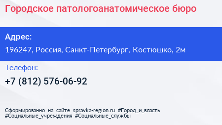 Городское патологоанатомическое бюро по адресу 196247, Россия, Санкт-Петербург, Костюшко, 2м в дальнейшем Организация, размещена в следующих категориях: