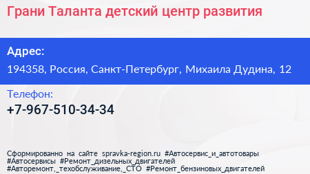 Грани Таланта, детский центр развития по адресу 194358, Россия, Санкт-Петербург, Михаила Дудина, 12 в дальнейшем Организация, размещена в следующих категориях: