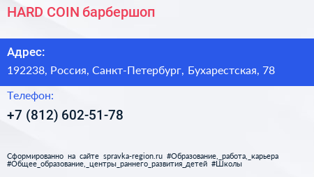 HARD COIN, барбершоп по адресу 192238, Россия, Санкт-Петербург, Бухарестская, 78 в дальнейшем Организация, размещена в следующих категориях: