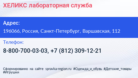ХЕЛИКС, лабораторная служба по адресу 196066, Россия, Санкт-Петербург, Варшавская, 112 в дальнейшем Организация, размещена в следующих категориях: