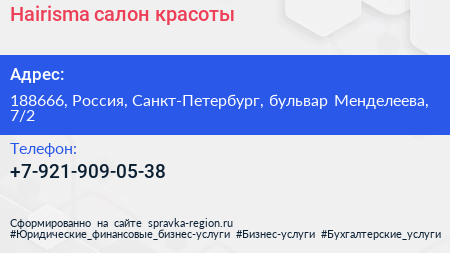 Hairisma, салон красоты по адресу 188666, Россия, Санкт-Петербург, бульвар Менделеева, 7/2 в дальнейшем Организация, размещена в следующих категориях: