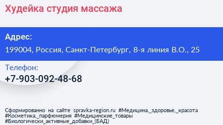 Худейка, студия массажа по адресу 199004, Россия, Санкт-Петербург, 8-я линия В.О., 25 в дальнейшем Организация, размещена в следующих категориях: