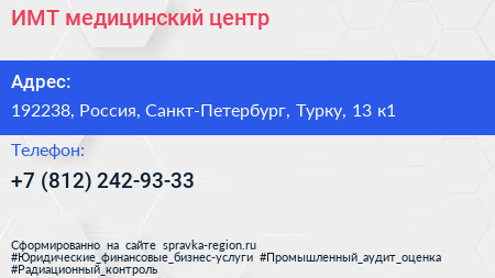 ИМТ, медицинский центр по адресу 192238, Россия, Санкт-Петербург, Турку, 13 к1 в дальнейшем Организация, размещена в следующих категориях: