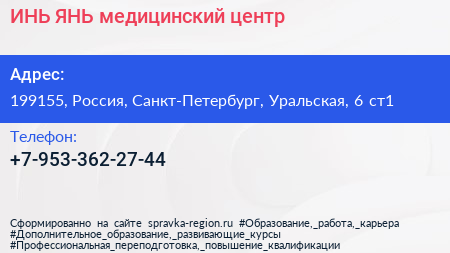 ИНЬ+ЯНЬ, медицинский центр по адресу 199155, Россия, Санкт-Петербург, Уральская, 6 ст1 в дальнейшем Организация, размещена в следующих категориях: