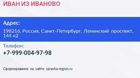 ИВАН ИЗ ИВАНОВО по адресу 198216, Россия, Санкт-Петербург, Ленинский проспект, 144 к2 в дальнейшем Организация, размещена в следующих категориях: