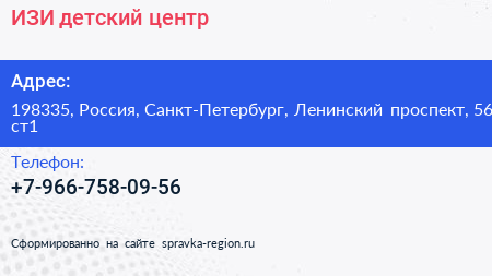 ИЗИ, детский центр по адресу 198335, Россия, Санкт-Петербург, Ленинский проспект, 56 ст1 в дальнейшем Организация, размещена в следующих категориях: