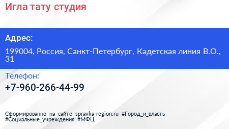 Игла, тату-студия по адресу 199004, Россия, Санкт-Петербург, Кадетская линия В.О., 31 в дальнейшем Организация, размещена в следующих категориях: