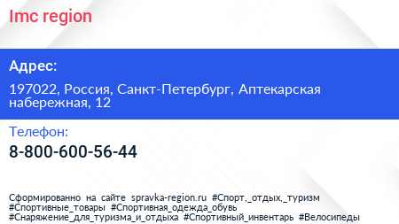 Imc region по адресу 197022, Россия, Санкт-Петербург, Аптекарская набережная, 12 в дальнейшем Организация, размещена в следующих категориях: