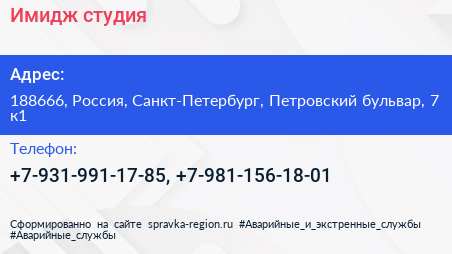 Имидж-студия по адресу 188666, Россия, Санкт-Петербург, Петровский бульвар, 7 к1 в дальнейшем Организация, размещена в следующих категориях: