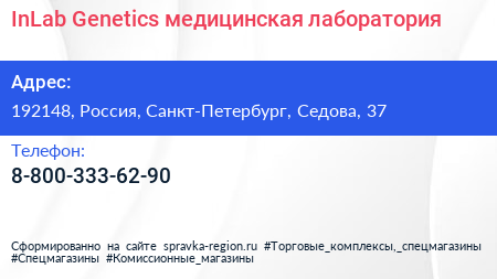 InLab Genetics, медицинская лаборатория по адресу 192148, Россия, Санкт-Петербург, Седова, 37 в дальнейшем Организация, размещена в следующих категориях: