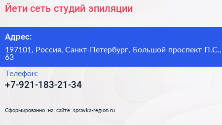 Йети, сеть студий эпиляции по адресу 197101, Россия, Санкт-Петербург, Большой проспект П.С., 63 в дальнейшем Организация, размещена в следующих категориях:
