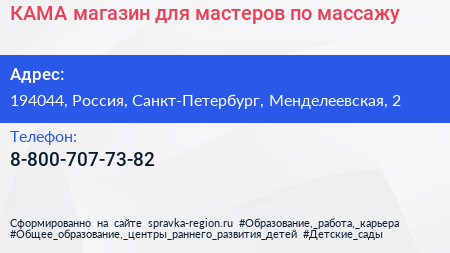 КАМА, магазин для мастеров по массажу по адресу 194044, Россия, Санкт-Петербург, Менделеевская, 2 в дальнейшем Организация, размещена в следующих категориях: