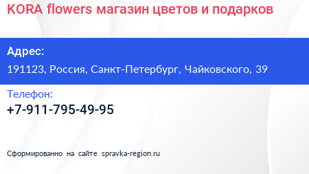 KORA flowers, магазин цветов и подарков по адресу 191123, Россия, Санкт-Петербург, Чайковского, 39 в дальнейшем Организация, размещена в следующих категориях: