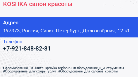 KOSHKA, салон красоты по адресу 197373, Россия, Санкт-Петербург, Долгоозёрная, 12 к1 в дальнейшем Организация, размещена в следующих категориях: