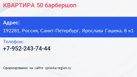 КВАРТИРА №50, барбершоп по адресу 192281, Россия, Санкт-Петербург, Ярослава Гашека, 8 к1 в дальнейшем Организация, размещена в следующих категориях: