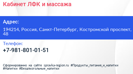 Кабинет ЛФК и массажа по адресу 194214, Россия, Санкт-Петербург, Костромской проспект, 48 в дальнейшем Организация, размещена в следующих категориях: