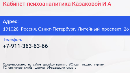 Кабинет психоаналитика Казаковой И.А. по адресу 191028, Россия, Санкт-Петербург, Литейный проспект, 26 в дальнейшем Организация, размещена в следующих категориях: