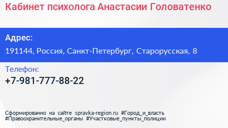 Кабинет психолога Анастасии Головатенко по адресу 191144, Россия, Санкт-Петербург, Старорусская, 8 в дальнейшем Организация, размещена в следующих категориях: