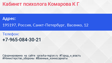 Кабинет психолога Комарова К.Г. по адресу 195197, Россия, Санкт-Петербург, Васенко, 12 в дальнейшем Организация, размещена в следующих категориях: