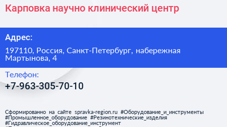 Карповка, научно-клинический центр по адресу 197110, Россия, Санкт-Петербург, набережная Мартынова, 4 в дальнейшем Организация, размещена в следующих категориях: