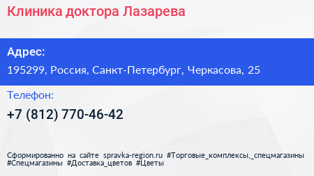Клиника доктора Лазарева по адресу 195299, Россия, Санкт-Петербург, Черкасова, 25 в дальнейшем Организация, размещена в следующих категориях: