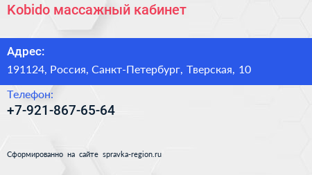 Kobido, массажный кабинет по адресу 191124, Россия, Санкт-Петербург, Тверская, 10 в дальнейшем Организация, размещена в следующих категориях:
