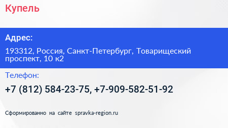 Для связи с организацией воспользуйтесь номером телефона: +7 (812) 584-23-75, +7-909-582-51-92. Ежедневно с 09:00 до 21:00, вы можете обратиться в эту организацию.