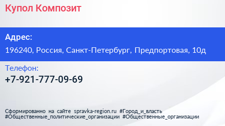 Купол-Композит по адресу 196240, Россия, Санкт-Петербург, Предпортовая, 10д в дальнейшем Организация, размещена в следующих категориях: